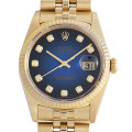 - 男女問わず永久のステータスシンボルとも言えるロレックス“デイトジャスト”。こちらは中心部から外周にかけて、ダイアルの色がブルーから深いブラックへと変化していく「ブルーグラデーションダイアル」を備えています。ダイヤインデックスがブラックカラー上に配されているため、ダイヤモンドの光沢感がより一層際立ちます。