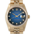 - 男女問わず永久のステータスシンボルとも言えるロレックス“デイトジャスト”。こちらは中心部から外周にかけて、ダイアルの色がブルーから深いブラックへと変化していく「ブルーグラデーションダイアル」を備えています。ダイヤインデックスがブラックカラー上に配されているため、ダイヤモンドの光沢感がより一層際立ちます。