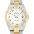 - デイトジャストにエンジンターンド回転ベゼルを搭載した通称“サンダーバード”が入荷です。アメリカ空軍公式チーム”サンダーバーズ”が、ドン・フェリス大佐の勇退を記念し、ロレックスに時計の製作を依頼したことから誕生したと言われています。こちらのモデルはイエローゴールドとステンレススティールのコンビが華やかなモデルで、ホワイトシェルダイアルにローマンインデックスを組み合わせた、ツートンカラーの安定感のあるダイアルデザインです。