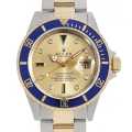 - 1953年に発表されたダイバーズウォッチサブマリーナは、50年以上経った今でもロレックスのスタンダードダイバーズとして絶大な人気を誇るモデルです。ケース前部には逆回転防止ベゼルが備わり、潜水時にボンベ内の酸素残量の計測や潜水時間を計る事が可能です。デイトジャストと共通の自動巻きCal.3135を搭載しており、オイスターケースやトリプロックリューズにより300mの防水性を実現しています。こちらは、華やかなイエローゴールドとのコンビになり、8Pダイヤ・3Pサファイアを配したゴージャスなモデルです。