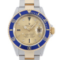 - 1953年に発表されたダイバーズウォッチサブマリーナは、50年以上経った今でもロレックスのスタンダードダイバーズとして絶大な人気を誇るモデルです。ケース前部には逆回転防止ベゼルが備わり、潜水時にボンベ内の酸素残量の計測や潜水時間を計る事が可能です。デイトジャストと共通の自動巻きCal.3135を搭載しており、オイスターケースやトリプロックリューズにより300mの防水性を実現しています。こちらは、華やかなイエローゴールドとのコンビになり、8Pダイヤ・3Pサファイアを配したゴージャスなモデルです。