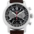 - ブラックの文字盤には、グレーのクロノグラフサブダイアルと蓄光性のアラビア数字の時間表示が施されています。日付表示が4時と5時の間に配置されており、クロノグラフの30分計と12時間計がそれぞれ3時と9時に配置されています。約60時間のパワーリザーブ。このモデルは世界限定1000本です?。