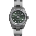 - 金属塊から削りだした防水性の高いオイスターケースと、全回転式ローターを搭載したパーペチュアル機構を搭載した「オイスターパーペチュアル」。デイトジャストよりもリーズナブルで、ダイアルコレクションが豊富に揃い、ケース違いでバリエーションが豊かなため年代を問わず幅広い層に受け入れられています。こちらは印象的なオリーブグリーン色のダイアルとシンプルなバーインデックスを備え、飽きのこないデザインに仕上がっています。
