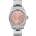 - 金属塊から削りだした防水性の高いオイスターケースと、全回転式ローターを搭載したパーペチュアル機構を搭載した“オイスターパーペチュアル”。様々なバリエーションが存在しますが、こちらはインデックスにアラビア数字とバーを使用したユニークなモデルです。K18ホワイトゴールド製フルーテッドベゼルとオイスターブレスの組み合わせは流通量が少なくとても希少です。