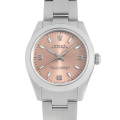 - 金属塊から削りだした防水性の高いオイスターケースと、全回転式ローターを搭載したパーペチュアル機構を搭載した「オイスターパーペチュアル」。デイトジャストよりもリーズナブルで、ダイヤルコレクションが豊富に揃い、ケース違いでバリエーションが豊かなため、年代を問わず幅広い層に受け入れられています。こちらはピンクの文字盤にホワイトのバーインデックス、369の数字が組み合わされたデザインで、上品な印象です。