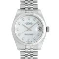 - 1945年に誕生し、今やロレックスの顔ともされる“デイトジャスト”は、金属塊から削りだした防水性の高いオイスターケース、午前0時頃瞬時に日付けが変わるデイトジャスト機構、全回転式ローターを搭載したパーペチュアル機構と、ロレックス三大機構を搭載したモデルです。様々なデザインバリエーションが存在しますが、こちらはステンレスケースににホワイトシェルダイアルを組み合わせ、10粒のダイヤモンドを配したラグジュアリーなモデルです。角度によって煌めきを変化させるホワイトシェルとダイヤの輝きが相乗効果で美しい一本です。