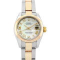 - 1945年にリリースされ、今やロレックスの顔とも言える“デイトジャスト”は、金属塊から削りだした防水性の高いオイスターケース、午前0時頃瞬時に日付けが変わるデイトジャスト機構、全回転式ローターを搭載したパーペチュアル機構と、ロレックスの三大機構を搭載したモデルです。こちらのモデルはイエローゴールドとステンレススティールのコンビが華やかなモデルで、ホワイトシェルダイアルにローマンインデックスを組み合わせた、ツートンカラーの安定感のあるダイアルデザインです。