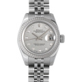 - 1945年にリリースされ、今やロレックスの顔とも言えるデイトジャスト。金属塊から削りだした防水性の高いオイスターケース、午前0時頃瞬時に日付けが変わるデイトジャスト機構、全回転式ローターを搭載したパーペチュアル機構と、ロレックス三大機構を搭載したモデルです。珍しいシルバーダストといったシェル文字盤の上に加工を施された文字盤、ダイアルに10粒のダイヤモンドを配し、ジュビリーブレスを採用することでラグジュアリーな雰囲気を醸し出しています。