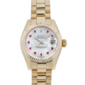 - 1945年にリリースされ、今やロレックスの顔とも言える“デイトジャスト”。ロレックス三大機構(金属塊から削りだした防水性の高いオイスターケース、午前0時頃瞬時に日付けが変わるデイトジャスト機構、全回転式ローターを搭載したパーペチュアル機構)を搭載したモデルです。こちらはシェルの文字盤にルビーのインデックスを配置した一本です。