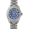 - 1945年にリリースされ、今やロレックスの顔とも言える“デイトジャスト”。金属塊から削りだした防水性の高いオイスターケース、午前0時頃瞬時に日付けが変わるデイトジャスト機構、全回転式ローターを搭載したパーペチュアル機構と、ロレックス三大機構を搭載したモデルです。こちらは珍しいソーダライト文字盤を採用し、インデックスに10粒のダイヤモンドをセッティングしたラグジュアリーな雰囲気を醸し出しているモデルです。