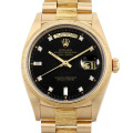- 1956年の誕生以来、ロレックスの最上級ラインとして最高級の素材と質感に拘ったハイクラスシリーズ“デイデイト”。素材はゴールドもしくはプラチナのみを使用しており、唯一フルカレンダーを搭載するモデルです。こちらは、ベゼルとブレスの中コマがバーク(樹皮のような)仕上げになっているのが特徴で、ダイアルも8ポイントのラウンドダイヤモンド・2ポイントのバゲットダイヤを配したゴージャスなデザインとなっています。