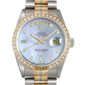 - ロレックスのハイエンドラインとして1956年に誕生した“デイデイト”。プラチナやゴールドなどの高級素材のみを使用しているモデルであり“富と成功の証”とも言われています 。こちらはイエロー、ピンク、ホワイトの3つのゴールドを使用した「トリドール」と呼ばれるブレスレットを備えたモデルです。現在は製造されておらず希少価値も高まっています。ベゼルとインデックスにはダイヤモンドを配し、目を惹くこと間違いなしです。6時位置の「ROLEX」の表記も非常に珍しいですね。
