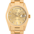 - 1956年の誕生以来、ロレックスの最上級ラインとして最高級の素材と質感に拘ったハイクラスシリーズ“デイデイト”。素材はゴールドもしくはプラチナのみを使用しています。ムーブメントには同社の高い技術力が生んだCal.3155クロノメーターを搭載し、ベゼルはロレックス伝統のフルーテッドベゼルを採用しています。こちらはシャンパンダイアルに、8Pダイヤモンドと2Pのバゲットダイヤモンドを配したゴージャスな一本です。