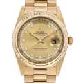 - ロレックスの最上級ラインとして1956年に誕生以来、最高級の素材と質感に拘ったハイクラスシリーズ「デイデイト」。素材はゴールドもしくはプラチナのみを使用しており、唯一フルカレンダーを搭載しています。こちらは、インデックスとサークル状にダイヤモンドが配置された、華やかな文字盤を用いてます。イエローゴールド素材が否応なく高級感を醸しております。