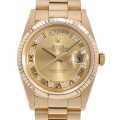 - ロレックスの最上級ラインとして1956年に誕生以来、最高級の素材と質感にこだわったハイクラスシリーズデイデイト。素材はゴールドもしくはプラチナのみを採用しており、唯一フルカレンダーを搭載しています。こちらはローマンインデックスの隙間を埋めるようにパヴェダイヤが配置された「ミリヤード」と呼ばれるデザインのダイアルです。ダイヤモンドとイエローゴールドによってより一層ゴージャス感が引き立つモデルです。