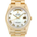 - 1956年の誕生以来、ロレックスの最上級ラインとして最高級の素材と質感に拘ったハイクラスシリーズ“デイデイト”。素材はゴールドを使用しており、唯一フルカレンダーを搭載するモデルです。こちらは人気のホワイトシェル文字盤にローマンインデックスを採用しており、通常のデイデイトよりさらに高級感溢れる逸品となっています。ベゼルにはロレックス伝統のフルーテッドベゼルを使用しております。