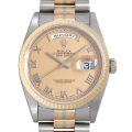 - ロレックスの最上級ラインとして1956年に誕生したハイクラスシリーズ“デイデイト”。高級素材のみを使用しているモデルであり“富と成功の証”とも言われています。こちらは、イエロー・ピンク・ホワイトの3色のゴールドを使用した“トリドールブレスレット”を備えたモデルです。現在は製造されておらず、希少価値も高まっています。