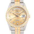 - ロレックスの最上級ラインとして1956年に誕生したハイクラスシリーズデイデイト”。高級素材のみを使用しているモデルであり富と成功の証”とも言われています 。こちらはイエロー、ピンク、ホワイトの3色のゴールドを使用したトリドールブレスレット”を備えたモデルです。現在は製造されておらず、希少価値も高まっています。ベゼル、インデックスにダイヤを配し、目を惹くこと間違いなしです。インデックスのダイヤはスクエアカットを用いています。