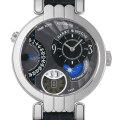 - モデル名の“エキセンター”とは「中心から外れた」という意味であり、その名の通り時針・分針が中心から少し外れて配置されています。そのすぐ下にはデイ/ナイトインジケーターがあり、これによりホームタイムの昼・夜を瞬時に知ることができます。特徴的なのは9時位置のレトログラードで、こちらで第二時帯を示します。6時位置にはアウトサイズデイト。ダイアルを透けさせることで日付ディスクの回転を楽しむことができます。デザイン性だけでなく、5日間(120時間)のパワーリザーブ、バックスケルトンから見える巻き上げ効率に優れた22Kゴールドローターなど機能面も充実しています。