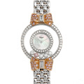 - ケース上下のリボンがチャームポイントになっている“ハッピーダイヤモンド・リボン”。 こちらはベゼルとラグにダイヤをセットし、ダイアルにはシェルを使用した華やかで上品なモデルです。 リボンの部分だけにローズゴールドを使用し、さらにピンクダイヤが可愛らしさを底上げしています。2重サファイアクリスタルの間をムービングストーンのダイヤモンドが動き美しく煌めくのもショパールならではです。