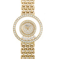 - デザイナーが散策中に、滝からほとばしる水滴が太陽の光を受けて美しく輝く様子を見て思いついたといわれる“ハッピーダイヤモンド”。2重サファイアクリスタルの間を動きまわる5つのダイヤと2つのルビーで巧みに表現しています。ベゼルに取り巻かれたダイヤと金無垢製イエローゴールドケースは存在感抜群で、目を惹くこと間違いなしです。