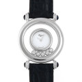 - デザイナーが散策中に、滝からほとばしる水滴が太陽の光を受けて美しく輝く様子を見て思いついたと言われるハッピーダイヤモンド。2重サファイアクリスタルの間を動き回る5つのムービングダイヤで巧みに表現しています。ベゼル部分にダイヤモンドがセットされていないシンプルなモデルですので、オン・オフ問わずオールシーンでご使用頂けます。