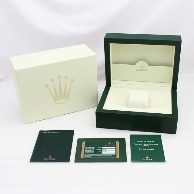 - 今回入荷した“デイデイトII”は、ロレックスの最上位機種であるデイデイトのケース径を41mmにサイズアップし、2009年に発表された新作モデルです。圧倒的な大振りケースと、腕にはめた時にズシリと感じる重量感は着け応えがあり、迫力ある存在感が魅力的です。