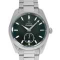 - オメガの代表的なモデルの「シーマスター アクアテラ」シリーズ。こちらはグリーンカラーのダイアルに、ヨットの船体をイメージしたホワイトシェルのインデックスが配置されています。ムーブメントにはオメガが誇るMETAS認定のコーアクシャルムーブメント、マスタークロノメーターCal.8802を搭載。パワーリザーブ約55時間。15気圧防水。