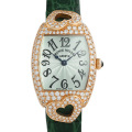 - フランクミュラーならではの美しく流麗なトノー(樽型)カーベックスにハートシェイプを模ったケース、パステルピンクのダイアルとストラップで、とてもフェミニンな印象のハイジュエリーウォッチです。ケースと尾錠にセッティングされたダイヤモンドは、ピンクゴールド素材によって、より一層の輝きを演出してくれます。リューズの先端に施された、サファイアカボションのグリーンがポイントです。ちなみに、モデル名の“COEUR”とはフランス語で“心(HEART)”を表しています。