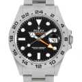 - エクスプローラーII誕生50周年にあたる2021年、Ref.226570が発表されました。先代216570からデザインは踏襲されていますが、通称ファントムと呼ばれる針のブラックコーティングがなくなり、高級感のある顔立ちとなりました。また、ラグがシャープ化したことでスタイリッシュな印象を持ち合わせます。さらに、搭載するムーブメントはロレックスが新世代と自負したCal.3285。この傑出したキャリバーは、高効率と安定的な高精度を実現しながらも、約70時間のロングパワーリザーブを誇ります。防水性は100m。