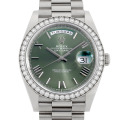 - ロレックスの最上級ラインとして1956年に誕生したハイクラスシリーズ“デイデイト”。こちらは、ロレックスが独自に開発・製造した最高の性能を誇る新世代機械式ムーブメント、キャリバー3255を搭載しています。 メインスプリングが収納される香箱も一新され、新採用されたクロナジーエスケープメントの効率性と合わせてパワーリザーブは約3日間に延長されました。こちらはベゼルにダイヤモンドをセッティングしたゴージャスなモデルです。