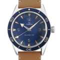 - プロ仕様のダイバーズウォッチ「シーマスター300」。こちらは2021年発表のモデルです。夜光はスーパールミノバ。秒針は先端が丸められたロリポップ針。文字盤の「Seemaster 300」の文字は初代シーマスターを想起させます。ムーブメントはCal.8912を搭載。パワーリザーブ60時間を誇り、実用性にも秀でています。レザーのベルトがアクセントになり、カジュアルな装いにも似合う1本です。