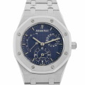 - “ロイヤルオーク”はラグジュアリー・スポーツウォッチとして1972年に発表され、今やオーデマ・ピゲの顔として高い人気を誇る代表作です。オーデマピゲの象徴である伝統的なオクタゴンケースは見る人を魅了します。こちらは「デュアルタイム(セカンドタイム)」 を搭載したモデルです。現行のデュアルタイムとほとんどデザインが変わらない旧型モデルです。 ポインターデイトやパワーリザーブも搭載されており使い勝手の良い1本です。
