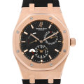 - ロイヤルオークはラグジュアリースポーツウォッチとして1972年に発表され、今やオーデマピゲの顔として高い人気を誇る代表作です。船窓をイメージした8角形の文字盤周りには、8本のネジが埋め込まれており、ベゼル、ケース、特殊防水ガスケット、ケースバック、すべてを貫通して固定しています。1つの時計で2つの時間を表示できるデュアルタイム機能を搭載し、ポインターデイトやパワーリザーブインジゲーターも備えているため、実用性が高く機能性の高い逸品です。