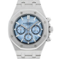 - ロイヤルオークの中でも希少性の高い世界限定100本のホワイトゴールド製クロノグラフモデルです。鮮やかなライトブルーのグランドタペストリーダイアルです。外周リングやインダイアルにはダークブルーがデザインされ、同系色のコントラストによって立体感と深みのある美しさを引き立てています。ムーブメントには、自社製のCal.2385を搭載しており、40時間のパワーリザーブを備えた信頼性の高いクロノグラフキャリバーです。