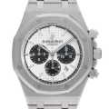 - ロイヤルオークはラグジュアリー・スポーツウォッチとして1972年に発表され、今やオーデマ・ピゲの顔として高い人気を誇る代表作です。こちらは20周年を記念して誕生したロイヤルオーク クロノグラフです。グランドタペストリーと呼ばれる仕上げが施されたシルバーダイアルに、バランスよく配置されたブラックのインダイアルとのコントラストが映えるデザインです。自動巻きCal.2385を搭載。パワーリザーブ40時間。防水性50m。2017年発表モデル。