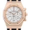 - 2012年 ロイヤルオークがモデルチェンジ。39mmから41mmにサイズアップし、ダイアルとベゼルのデザインが大きく見直されています。こちらはピンクゴールド製のストラップモデル。ピンクゴールドのモデルは派手になりがちですが、落着きすら感じさせるのはオーデマピゲならではです。