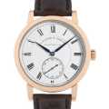 - ドイツ高級機械式時計の最高峰メーカーと称される<ランゲ&ゾーネ>。200本限定の本モデルは、機械式手巻きムーブメント「Cal.L044.1」を搭載。肌馴染みの良い18Kピンクゴールド製ケースに、白色のエナメルダイアルが際立つ端正なデザインは、一見すると控えめで飾り気のない佇まいですが、洗練された上品さと格調高さを感じさせます。ムーブメントには、鎖を用いてぜんまいの動力を伝える「チェーンフュージー機構」を搭載。微小な鎖で螺旋状の部品を引っ張り、最外周の歯車を時計に伝え、ぜんまいが伸びるに従い変化するトルクを一定に保つ仕組みです。636個もの微細なパーツから構成されるこのチェーンは、シースルーバック越しにその一部を確認することができます。