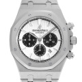 - ロイヤルオークはラグジュアリー・スポーツウォッチとして1972年に発表され、今やオーデマ・ピゲの顔として高い人気を誇る代表作です。こちらは20周年を記念して誕生したロイヤルオーク クロノグラフです。グランドタペストリーと呼ばれる仕上げが施されたシルバーダイアルに、バランスよく配置されたブラックのインダイアルとのコントラストが映えるデザインです。自動巻きCal.2385を搭載。パワーリザーブ40時間。防水性50m。2017年発表モデル。