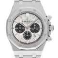 - ロイヤルオークはラグジュアリー・スポーツウォッチとして1972年に発表され、今やオーデマ・ピゲの顔として高い人気を誇る代表作です。こちらは20周年を記念して誕生したロイヤルオーク クロノグラフです。グランドタペストリーと呼ばれる仕上げが施されたシルバーダイアルに、バランスよく配置されたブラックのインダイアルとのコントラストが映えるデザインです。自動巻きCal.2385を搭載。パワーリザーブ40時間。防水性50m。2017年発表モデル。