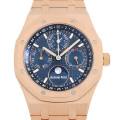 - モダンでエレガントなロイヤルオークに、オーデマピゲ渾身のパーペチュアルカレンダーが融合したモデルです。エッジのきいたロイヤルオーク特有のオクタゴンケースにおさめられたシルバーダイアル上には、月・デイト・曜日・ムーンフェイズが端正に並びます。搭載する自動巻きキャリバー5134は、同社が「140年の歴史の集大成」と自負する傑作機。パワーリザーブ40時間と実用性も健在です。20M防水。