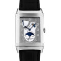 - ラテン語で「回転させる」という意味を持つレベルソ。1930年頃、貴族の間で盛んだったポロ競技で運動中の衝撃からガラスとダイヤルを保護する目的で考案された時計です。ケースそのものを180度回転するという構造は、当時革新的な技術として多くの注目を集めました。レクタンギュラー(長方形)にこだわった角型ムーブメントは、世界に唯一ジャガー・ルクルトだけが専用かつオリジナルを追及し開発を続けています。表側にはムーンフェイズ・パワーリザーブ・デイ&ナイト・スモールセコンドを配し、180度回転させた裏側はシースルーバックのため精巧なムーブメントをご覧いただけます。