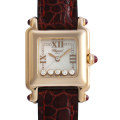 - “ハッピーダイヤモンド”の大ヒットを受け、1993年に発表された“ハッピースポーツ”。それまでにはなかった斬新でキュートなデザインが高い評価を受け、瞬く間に人気シリーズの仲間入りを果たしました。ダイアルの上には2枚のサファイヤガラスが重ねられており、その間を5つのダイヤモンドが流れるように動き回ります。