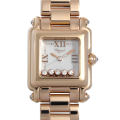 - ハッピーダイヤモンドの大ヒットを受け、1993年に発表されたハッピースポーツ。 それまでに無かった斬新でキュートなデザインが高い評価を受け、瞬く間に人気シリーズの仲間入りを果たしました。ダイアルの上には2枚のサファイヤガラスが重ねられており、その間を5つのダイヤモンドが流れるように滑ります。ケース、ブレス、針、インデックスがローズゴールドを基調に統一されており、豪華さと上品さを兼ね備えた贅沢な逸品です。