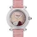 - ハッピーダイヤモンドの大ヒットを受けて、1993年に発表されたハッピースポーツ。それまでにはなかった斬新でキュートなデザインが高い評価を受け、またたく間に人気シリーズの仲間入りを果たしました。こちらはピンクシェルダイアルの上にハート型のダイヤとルビーを配した珍しいモデルです。ラグとリューズにもルビーをセッティングし愛らしい仕上がりです。 ケース径32mmのミディアムサイズになります。
