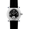 - ハッピーダイヤモンドの大ヒットを受け、1993年に発表されたハッピースポーツ。それまでに無かった斬新でキュートなデザインが高い評価を受け、瞬く間に人気シリーズの仲間入りを果たしました。ダイアルの上には2枚のサファイヤガラスが重ねられており、その間をダイヤが流れるように滑ります。リューズとラグサイドにはサファイアを使用しており、豪華さと上品さを兼ね備えた贅沢な逸品です。