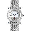 - “ハッピーダイヤモンド”の大ヒットを受け、1993年に発表された“ハッピースポーツ”。それまでには無かった斬新でキュートなデザインが高い評価を受け、瞬く間に人気シリーズの仲間入りを果たしました。ホワイトダイアルの上には2枚のサファイヤガラスが重ねられており、その間を6石の宝石が流れるように動き回ります。 ケース、リューズのカボションにはブルーサファイアがセッティングされ上品な仕上がりです。