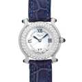 "ハッピーダイヤモンド"の大ヒットを受けて、1993年に発表された"ハッピースポーツ"。それまでにはなかった斬新でキュートなデザインが高い評価を受け、瞬く間に人気シリーズの仲間入りを果たしました。ダイアルの上には2枚のサファイヤガラスが重ねられており、その間を5つのダイヤモンドが流れるように動き回ります。こちらは、その5つのダイヤモンドを取り囲むようにさらにベゼルにまで贅沢にダイヤモンドを配した、一層高級感漂うモデルです。
