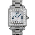 - “ハッピーダイヤモンド"の大ヒットを受け、1993年に発表された“ハッピースポーツ”。それまでにはなかった斬新でキュートなデザインが高い評価を受け、瞬く間に人気シリーズの仲間入りを果たしました。ダイアルの上には2枚のサファイヤガラスが重ねられており、その間を7つのダイヤモンドが流れるように動き回ります。ベゼルにも贅沢にダイヤを配し、ラグサイドとリューズ位置のカボションにはサファイヤを使用するなど、豪華さと上品さを兼ね備えた贅沢な逸品です。