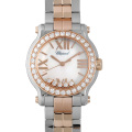 - “ハッピーダイヤモンド”の大ヒットを受け、1993年に発表された“ハッピースポーツ”。それまでに無かった斬新でキュートなデザインが高い評価を受け、瞬く間に人気シリーズの仲間入りを果たしました。ダイアルの上を5つのダイヤモンドが動き回ります。ベゼルにも贅沢にダイヤを配し、豪華さと上品さを兼ね備えた贅沢な逸品です。